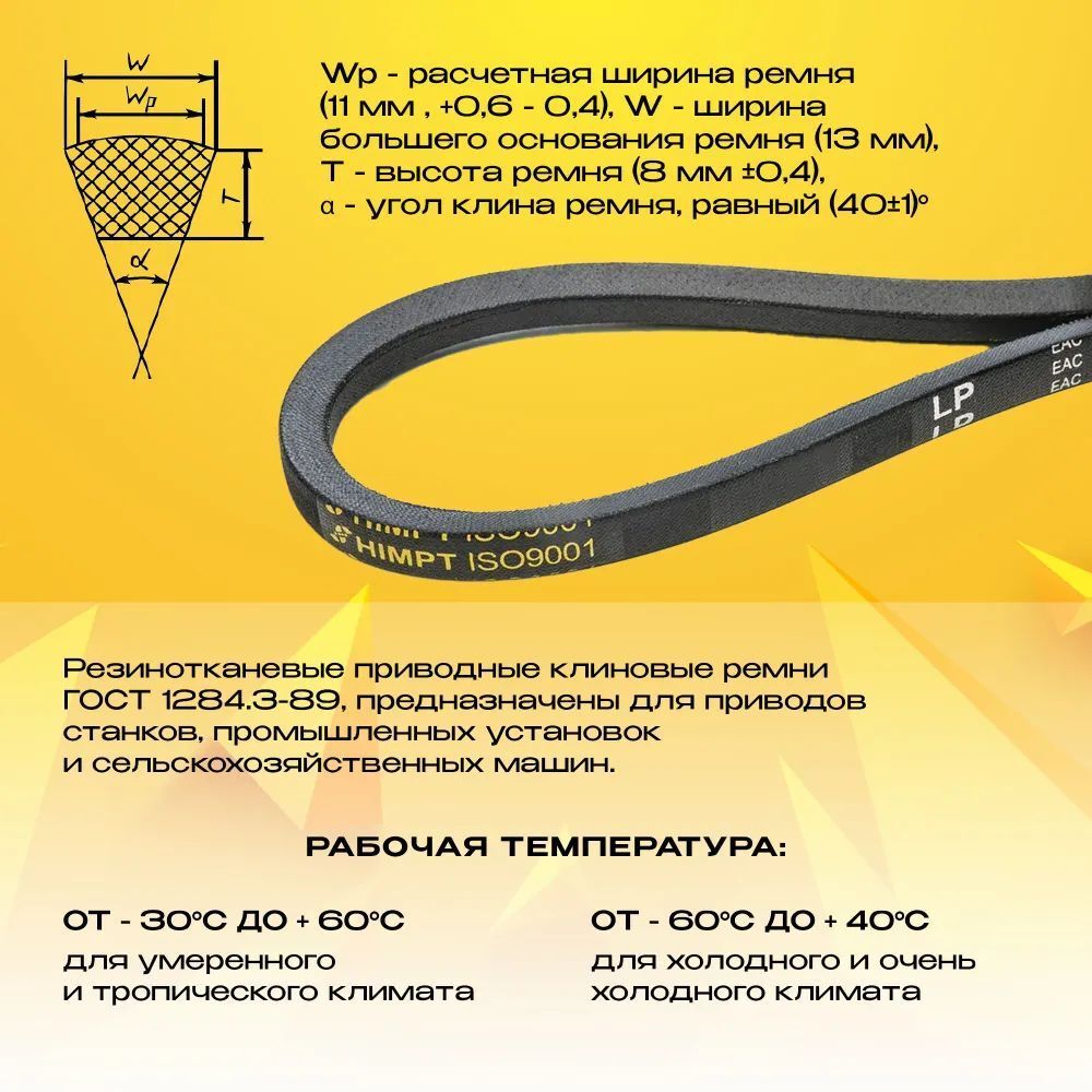 Ремень приводной клиновой А изготовлен из качественных материалов, что делает его устойчивым к различным неблагоприятным условиям эксплуатации, включая высокие температуры и воздействие масел. Этот автомобильный ремень специально сконструирован для обеспечения высокой степени натяжения и минимальных потерь на прокрутку, что существенно увеличивает эффективность работы двигателя.